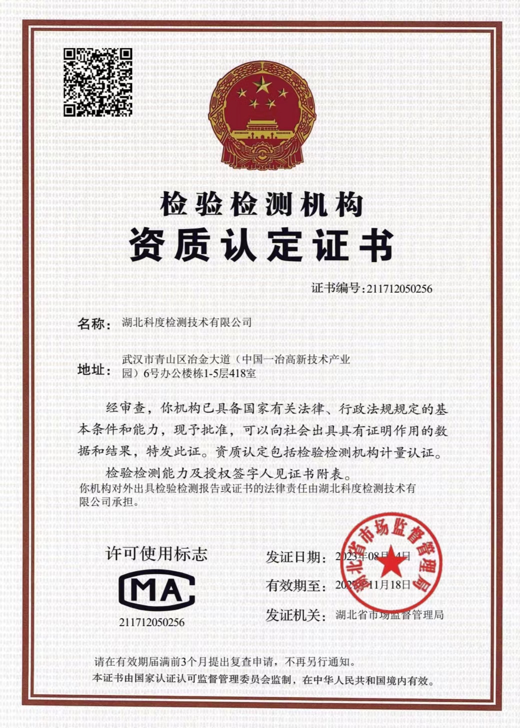 湖北科度檢測(cè)技術(shù)有限公司是一家專業(yè)從事環(huán)境類(lèi)及相關(guān)領(lǐng)域檢測(cè)的第三方檢測(cè)機(jī)構(gòu),公司已通過(guò)湖北省市場(chǎng)監(jiān)督管理局CMA計(jì)量認(rèn)證,可以面向社會(huì)出具權(quán)威CMA檢測(cè)報(bào)告。 我公司實(shí)驗(yàn)室嚴(yán)格按照國(guó)家標(biāo)準(zhǔn)建設(shè),擁有一大批國(guó)內(nèi)外先進(jìn)儀器設(shè)備及現(xiàn)代化配套設(shè)施,并有經(jīng)驗(yàn)豐富的中高級(jí)專業(yè)技術(shù)人員和嚴(yán)格的實(shí)驗(yàn)室質(zhì)量保證體系為項(xiàng)目運(yùn)作提供強(qiáng)力支撐。 作為第三方檢測(cè)機(jī)構(gòu),公司始終以高度的社會(huì)責(zé)任感經(jīng)營(yíng)企業(yè),以“公正、嚴(yán)謹(jǐn)、高效”為宗旨,依托專業(yè)的技術(shù)實(shí)力為客戶提供專業(yè)優(yōu)質(zhì)檢測(cè)服務(wù),受到政府、企業(yè)和社會(huì)各界的廣泛關(guān)注和認(rèn)可。
